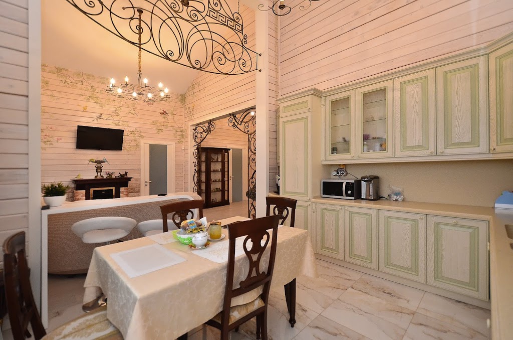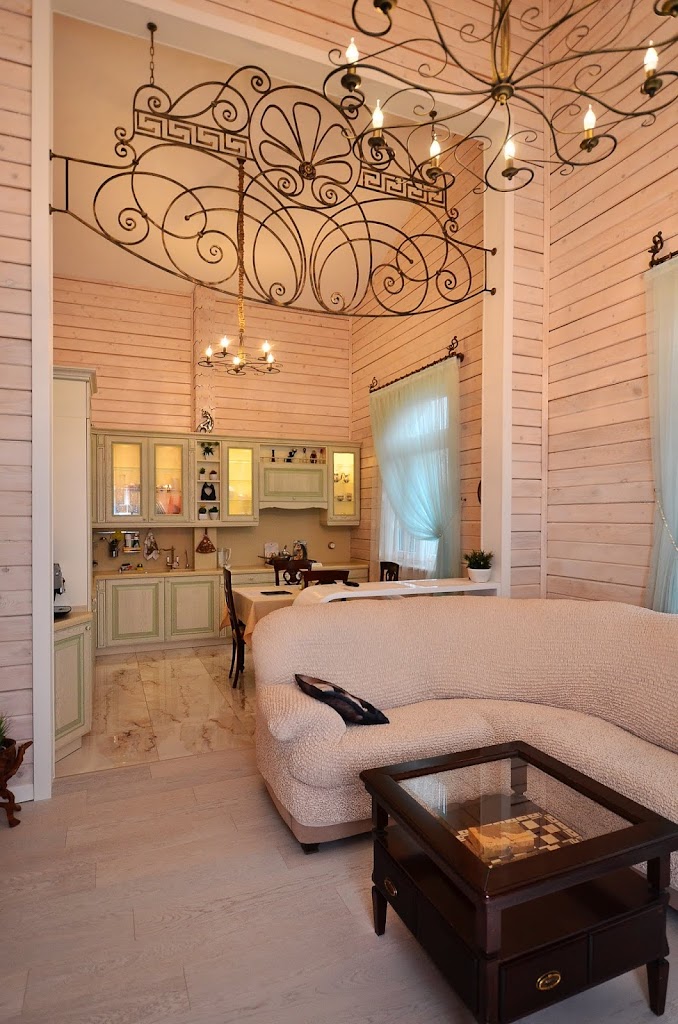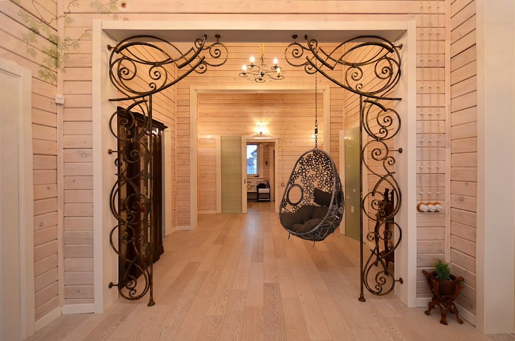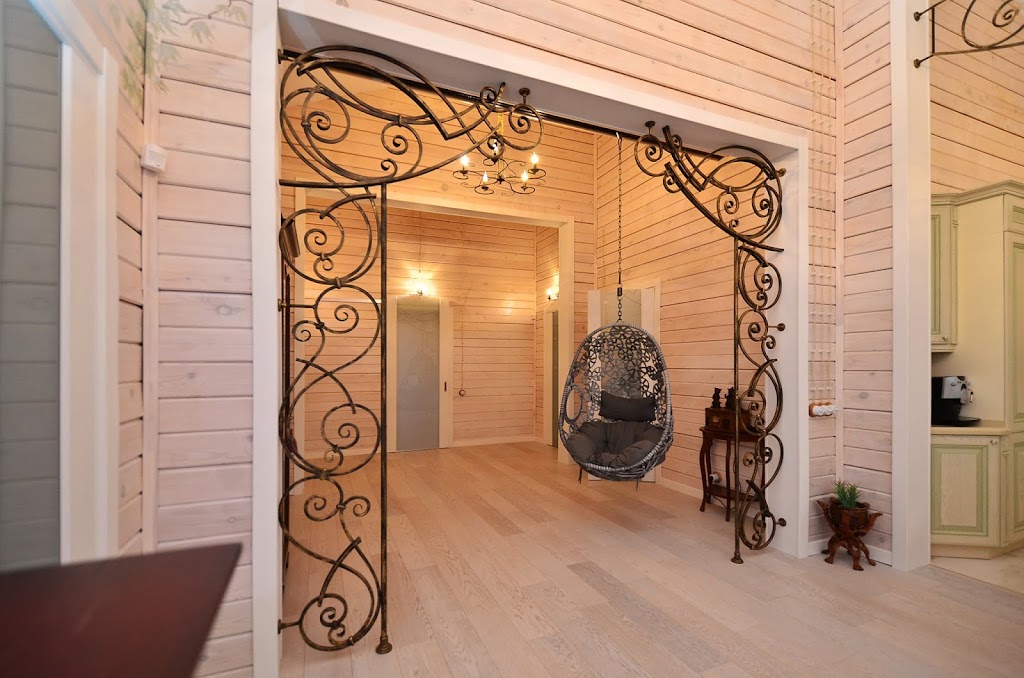 Высота потолка в коньке около 6 метров. Проёмы так же были не стандартных размеров, для их декорирования были изготовлены кованные решетки.