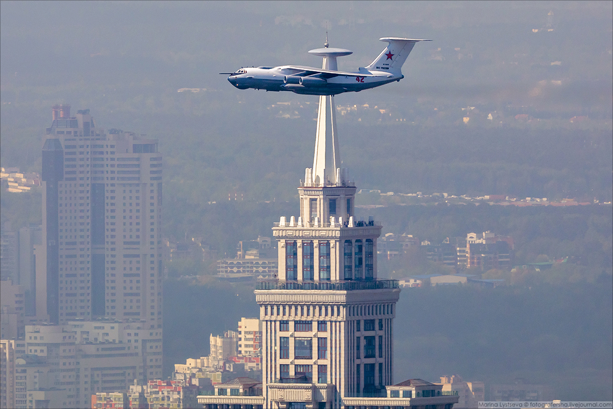 Самолёт дальнего радиолокационного обнаружения и управления А-50 на фоне «Триумф-паласа».