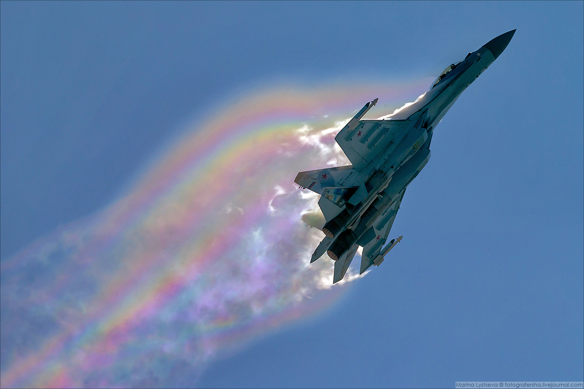 Истребитель Су-30СМ «Русских витязей» крутит утром одиночный пилотаж (Вячеслав Аверьянов, привет!) и на определенном угле атаки собирает на себе радужное облако.