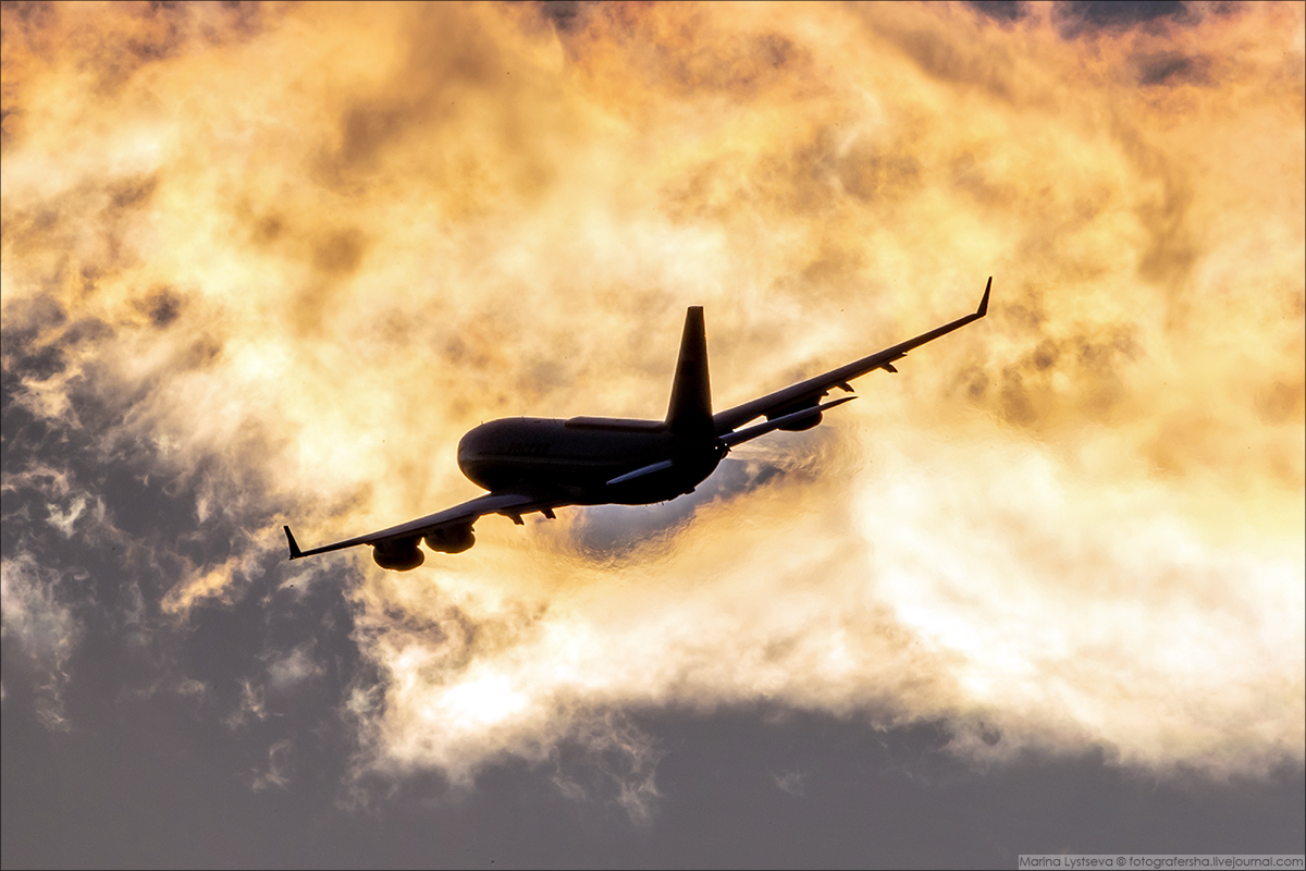 Один из самых красивых российских лайнеров Ил-96 из президентского авиаотряда покидает на закате авиасалон МАКС.