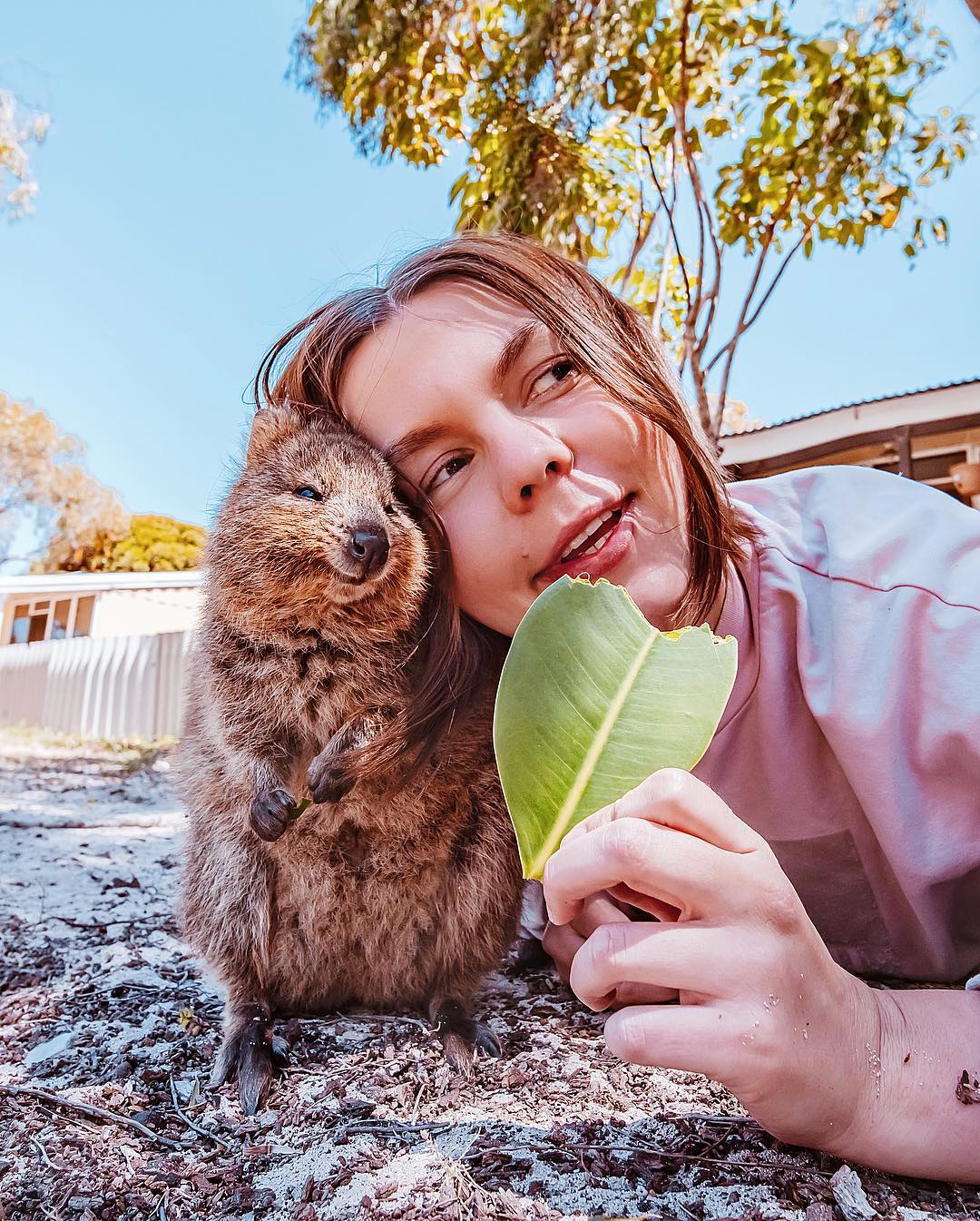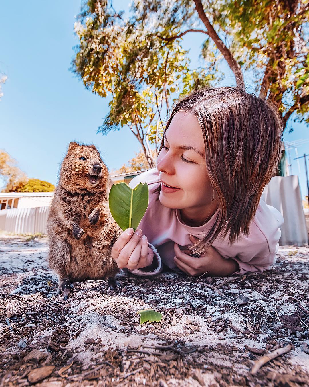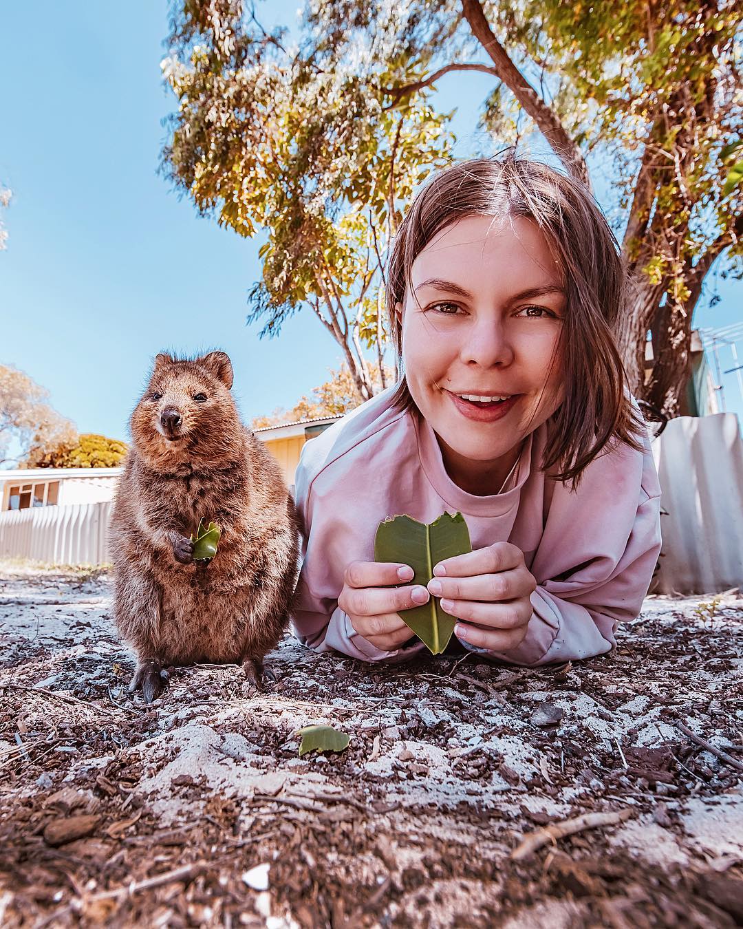 «Когда я впервые увидела квокку на случайном изображении в интернете, мой муж сказал мне, что я очень на них похожа. Мы пролетели 25 часов на самолёте и ещё 1,5 часа проплыли на пароме, чтобы увидеть их вживую. Однажды посмотрев на них — уже невозможно забыть! Мы пролетели всю планету, чтобы увидеть квокк. И это того стоило! Я нигде не чувствовала себя счастливее, чем здесь, лёжа на песке и предлагая этим зверюшкам зелёные листочки. К квоккам нельзя прикасаться, но когда они прижимались к моему лицу, я не могла представить себе ничего более приятного. Теперь, когда мне грустно или я устала, я просто открываю фотографии, смотрю на квокк и улыбаюсь» — рассказала Кристина
