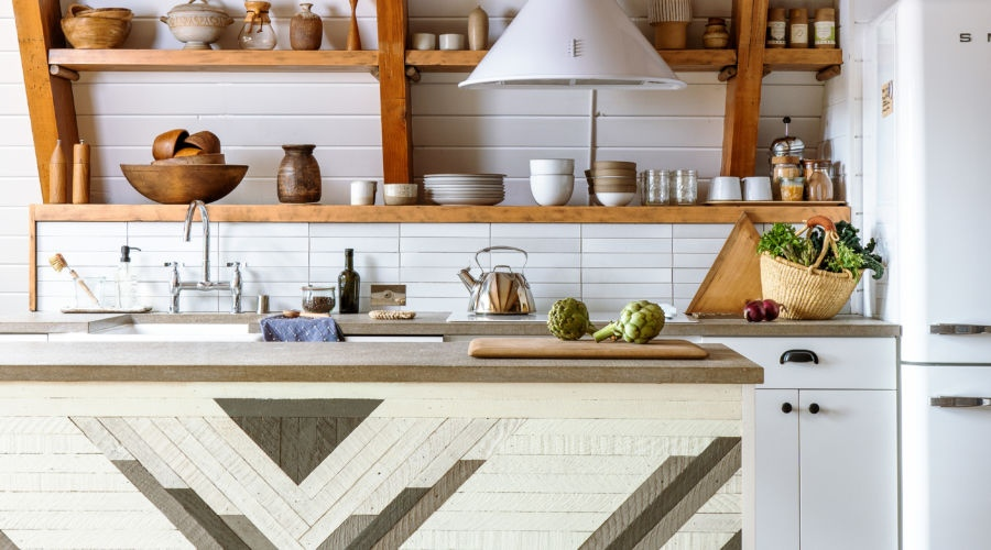 Внутри дома уютно и светло — белые стены контрастируют с мебедлью и черным камином.