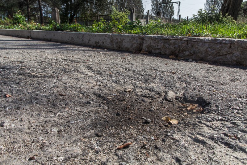 Мы проезжаем по усыпанной посеченными пулями и осколками ветками дороге. Украинские позиции совсем близко. Дорога простреливается. Нервозность нарастает, ведь в любой момент украинский снайпер может произвести выстрел, независимо от того, кто в автомобиле: мирные или военные. Притормаживаем около простреленных ворот. Рядом изрешеченная вывеска "Вода Донбасса". На территории насосной станции много воронок. Одна рядом с разбитым трактором. Ещё несколько замечаем вблизи одного из зданий. На стене - следы гранаты АГС, "снежинка".