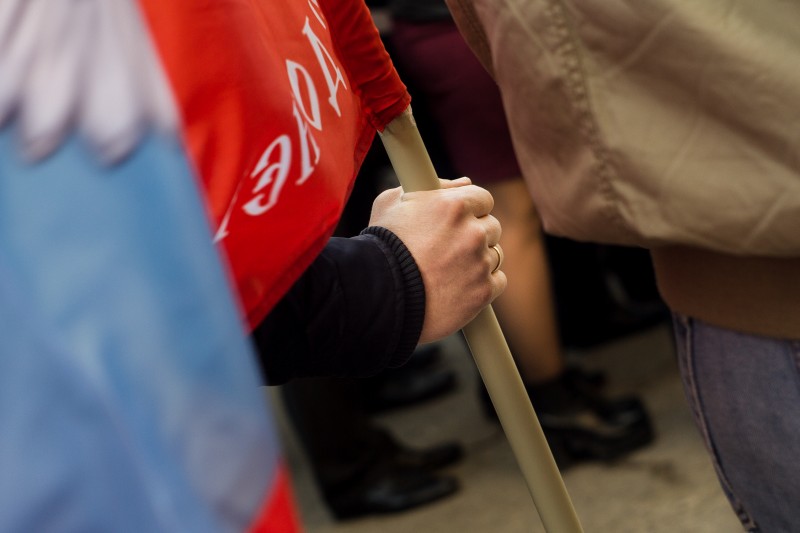 А затем был уже привычный митинг-реквием. Несколько человек держат флаги, у микрофона кто-то из чиновников произносит речь, играет минорная музыка, а затем каждый может возложить цветы к неприметной табличке на стене по улице Университетской.