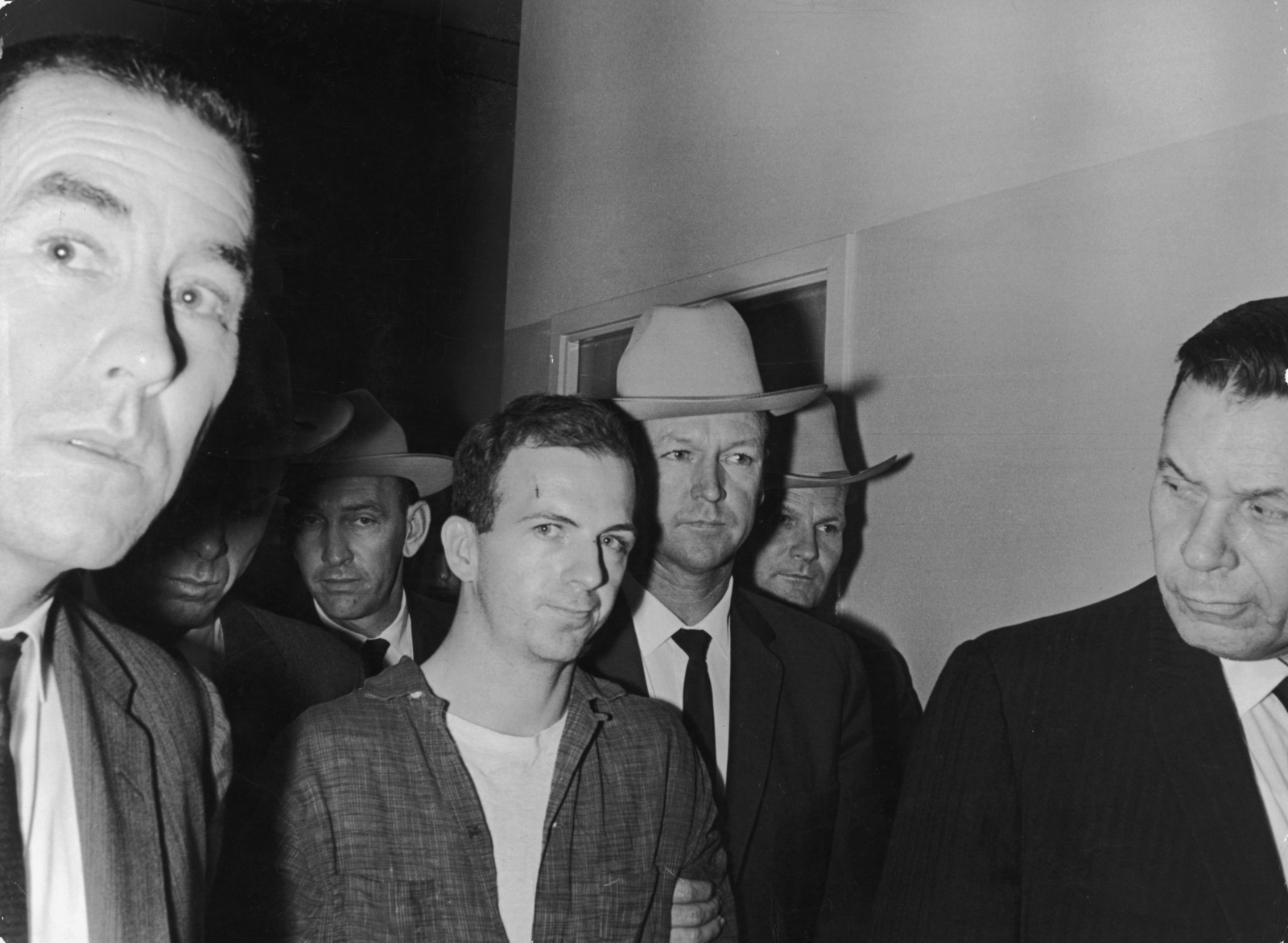 Ли Харви Освальд сопровождается в наручниках полицией Далласа для допроса после убийства президента Джона Ф. Кеннеди