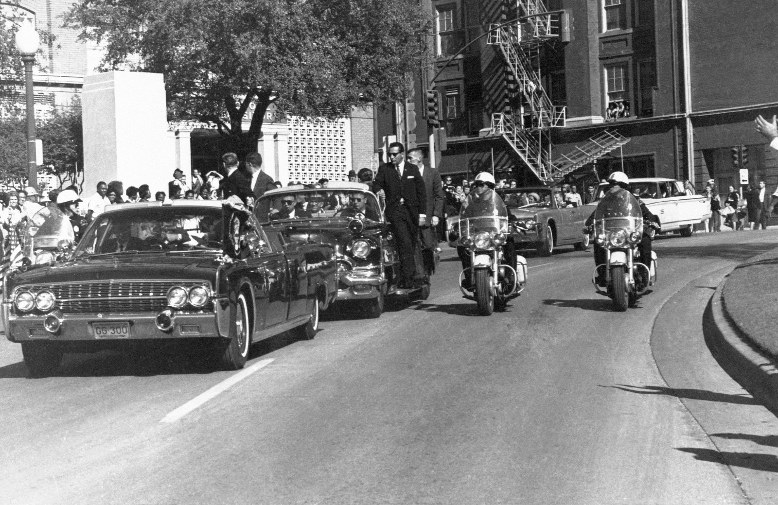 Президент Джон Ф. Кеннеди, первая леди Жаклин Кеннеди, губернатор Техаса Джон Конналли и его жена Нелли Коннелли едут вместе в кабриолете в Далласе