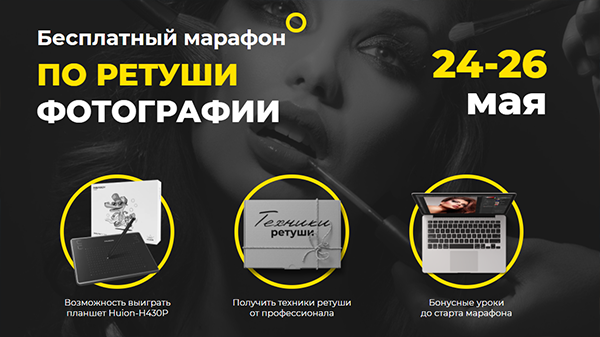 С 24 по 26 мая пройдёт бесплатный марафон по ретуши. Три дня онлайн встреч с Евгением Карташовым, где вы сможете задавать вопросы, сделаете два домашних задания и поучаствуете в розыгрыше графического планшета Huion.