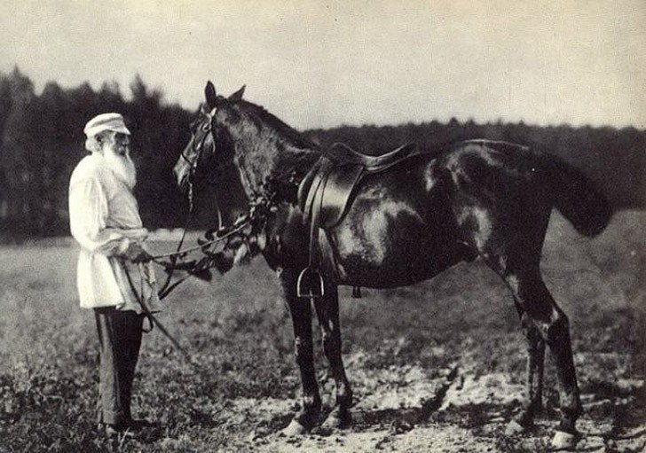 Лев Толстой с любимым конем Делиром. Ясная Поляна, 1908 год