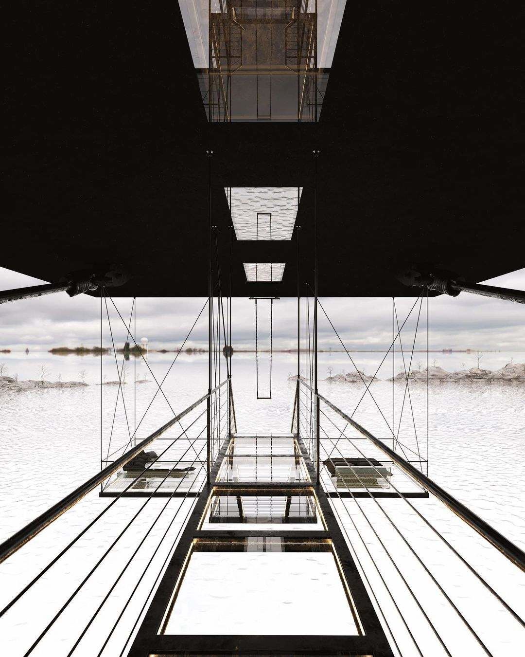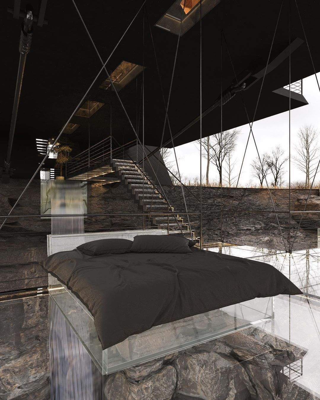 Внутри помещения созданы все комфортные условия для проживания. Пол прозрачный, через него видно все, что происходит под домом. С помощью открытого жилого пространства и стеклянного пола архитектор стремится усилить ощущение воздушной невесомости, но также и чувство страха. В это пространство можно попасть через узкий и приподнятый пешеходный мост, который также имеет стеклянное покрытие.