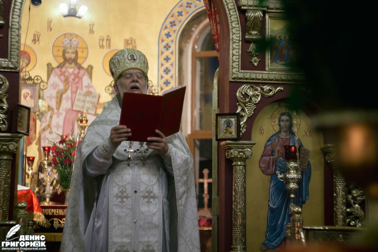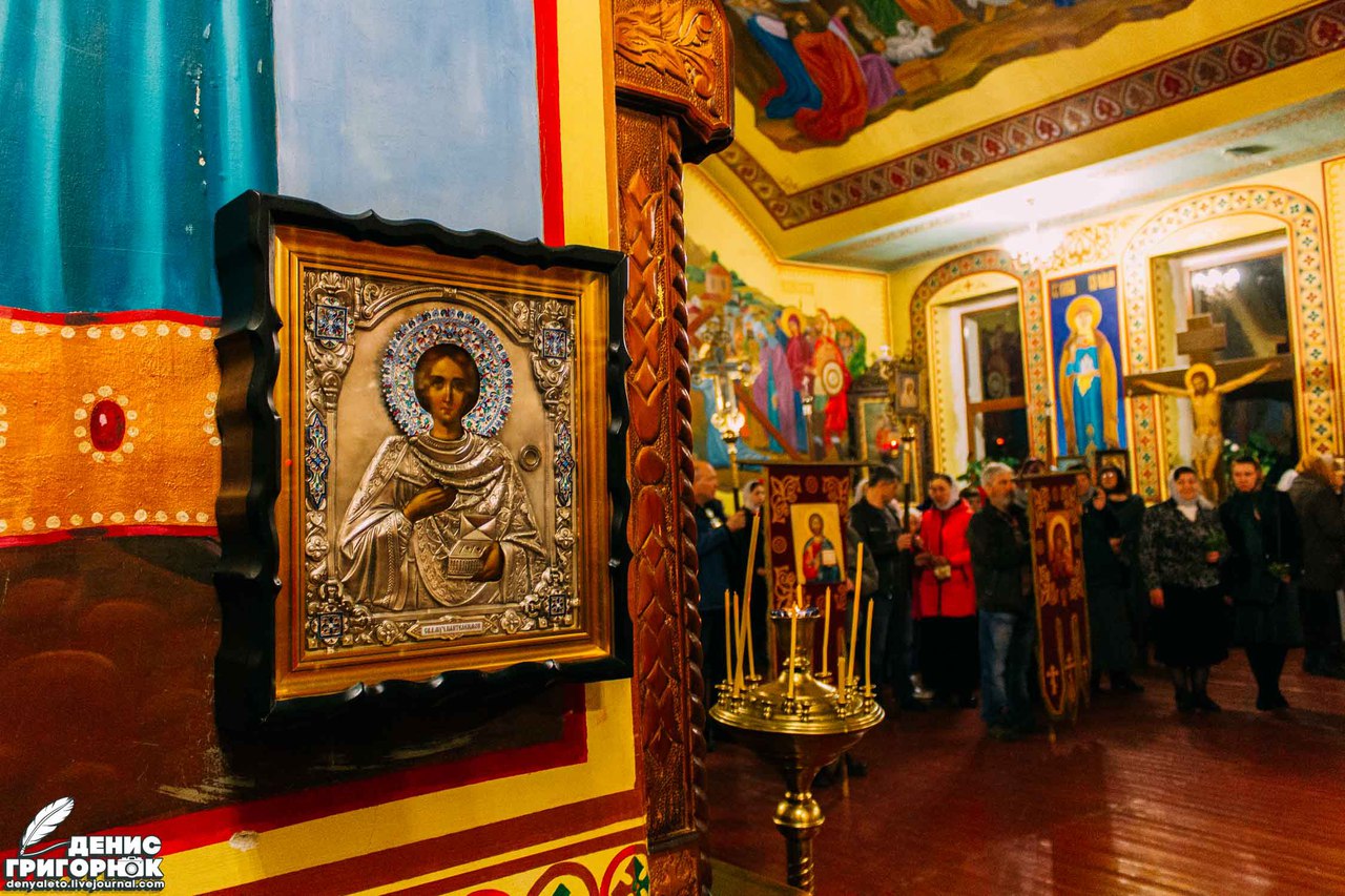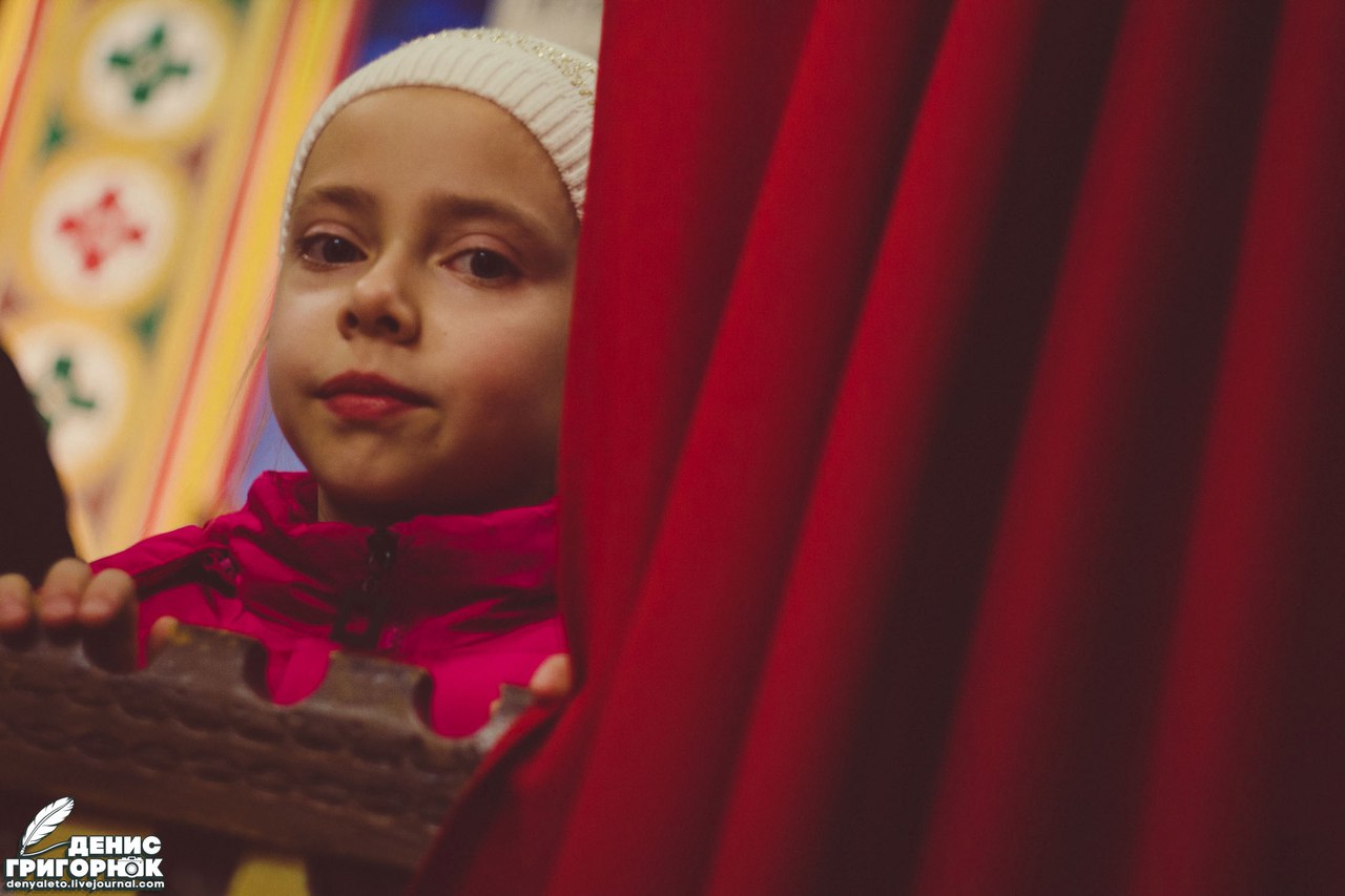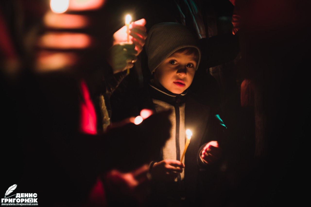 Признаюсь, что впервые был на всенощном бдении. Для меня это стало чем-то новым и неизвестным ранее. Сложно подобрать слова, которые могли бы в полной мере описать это состояние. Наиболее близким будет словосочетание — чувство умиротворения. Несмотря на то, что в нескольких сотнях метров находился Донецкий аэропорт, люди не боялись. Их даже не посещала мысль, что в любой момент украинская мина может вонзиться в стену святыни, разбросать смертоносные осколки. Мысли сейчас были не об этом. Люди молились, склонив головы. Маленькие дети послушно выполняли всё необходимое: пели, молились, держали свечи. Даже не знаю, что меня больше впечатлило — процессия или разрушенный Иверский монастырь.