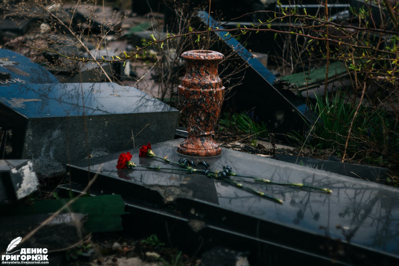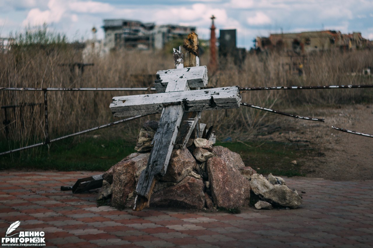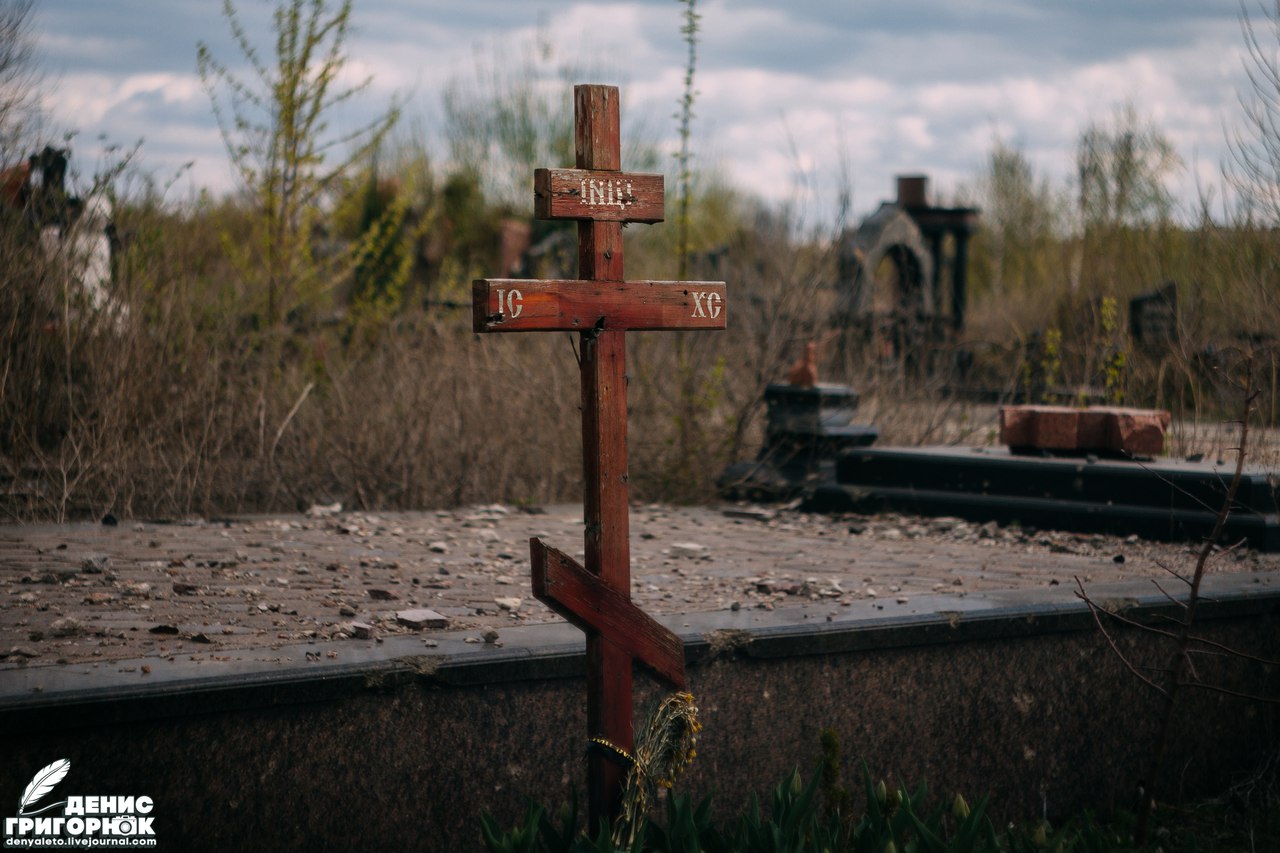 Мы всё же решили съездить на Иверский монастырь. Даже, если службы там не будет, то мне хотелось показать россиянину, что сотворила война со святыней. Впечатления усиливались. С каждым метром усыпанной осколками дороги Дмитрий ужасался всё сильнее. Сначала бросило в дрожь от разбитых могил на Иверском кладбище, а после добил вид самого женского монастыря. Машина остановилась, потрескивая металлом под колёсами. Я заметил, что это место опустело. Чего-то не хватало. Потом я понял, что постепенно прихожане и священнослужители убрали разбитые бетонные плиты, простреленного забора. Фотографы любили делать снимки разрушенных памятников сквозь дыры от осколков. Сейчас это осталось в прошлом. Так же, я не нашел знакомой неразорвавшейся мины, которая лежала в прошлый раз прям на одной из могиле у самой дороги к монастырю. Отсутствовала и табличка "Мины". Но всё же один торчащий хвостовик мой взгляд нащупал. Казалось, он стал частью мемориала, застряв в брусчатке. Среди разваленных монументов был один, который все журналисты снимали, приехав на Иверское кладбище. Изменения произошли и с ним. У подножия обезглавленного памятника лежала его голова. Местные нашли её и положили рядом. Бессмысленно сейчас его восстанавливать, ведь снаряды падают сюда до сих пор.