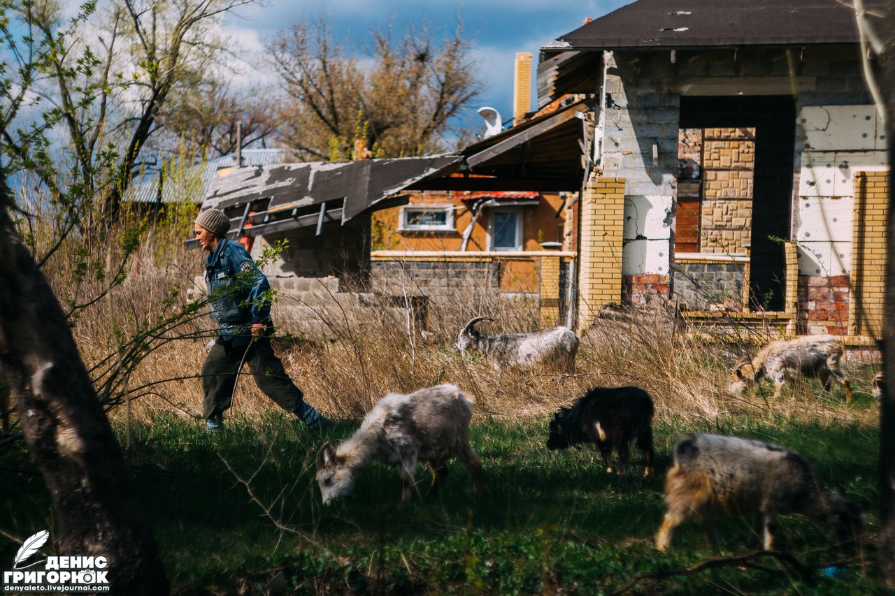 Из-за бетонного месива я не узнал нужный поворот. Нужно было спросить у местных дорогу, но улица казалась необитаемой. Как вдруг я заметил старушку, которая пасла стадо коз. Животные долбили копытами по изрешеченному асфальту. Женщина пыталась поспеть за своими подопечными, когда козы сорвались с места. Это меня насторожило. Животные обычно чувствую опасность, но сейчас была ложная тревога. Дело в том, что козы почуяли не опасность, а траву, которую тут же кинулись щипать. Совершенно невероятное зрелище, но здесь — это норма. Местные выгуливают коров и коз среди руин под автоматные выстрелы и работу артиллерии. Вот и сейчас послышались миномёты и крупнокалиберные пулемёты. Это не остановило ни старушку, ни стадо.