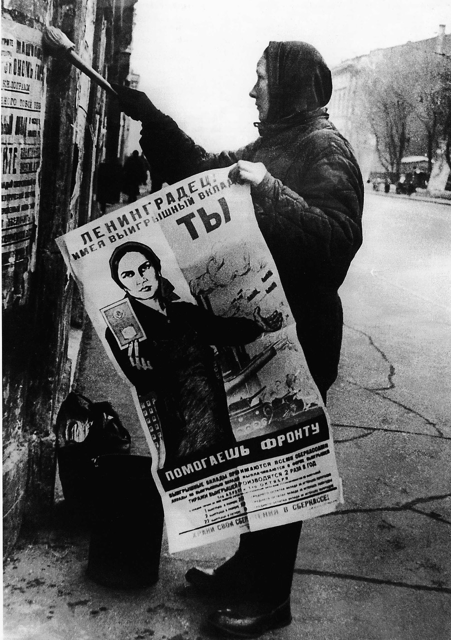 1943. Женщина расклеивает агитационные плакаты в блокадном Ленинграде