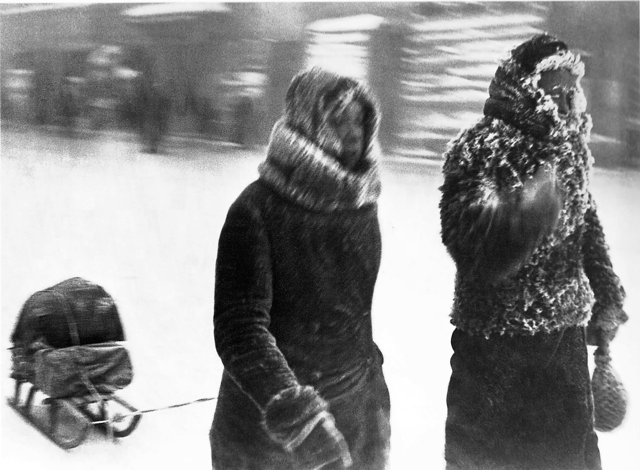 1942, январь. Ленинградцы на Загородном проспекте во время мороза -30.