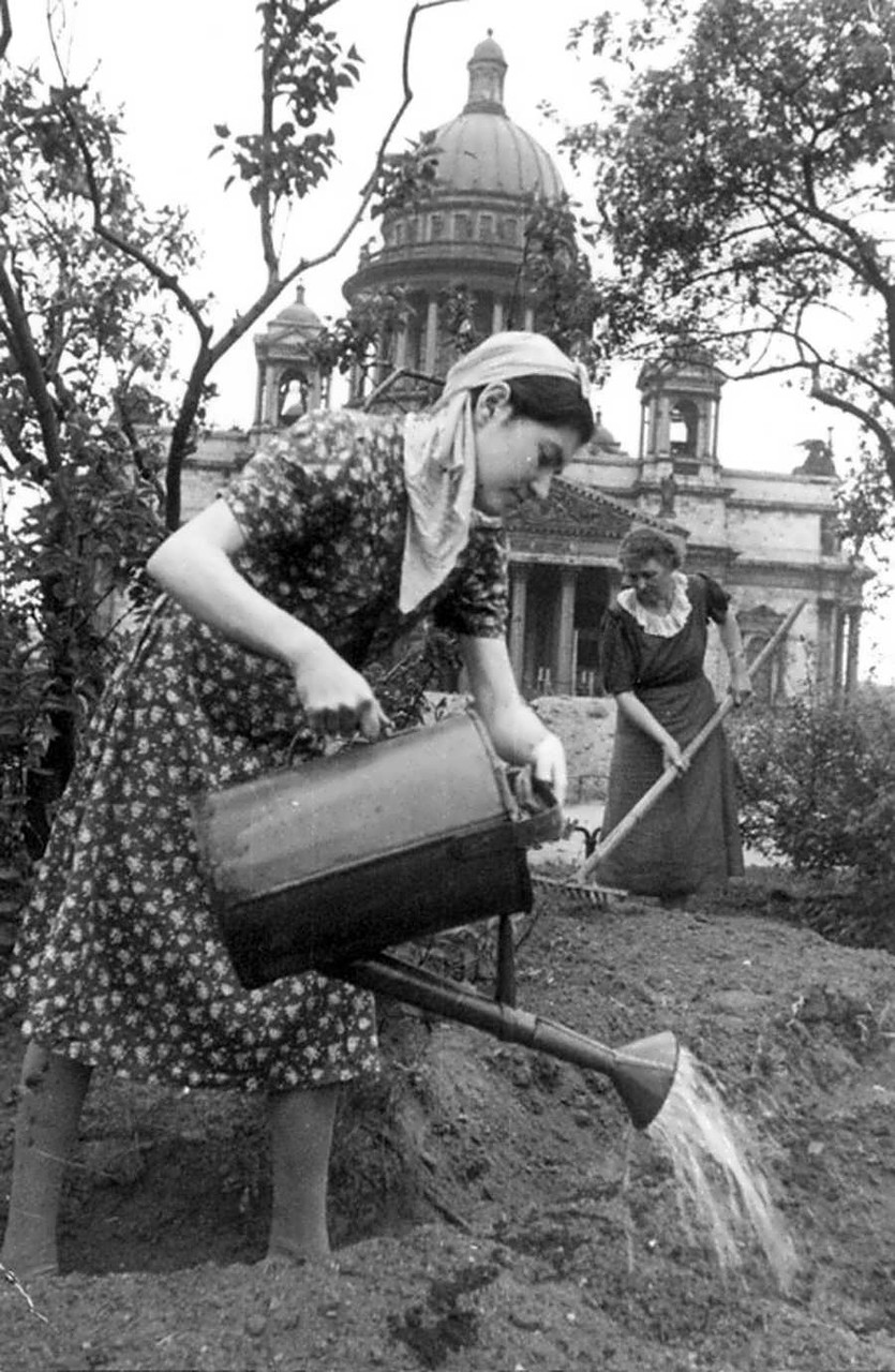 Женщины обрабатывают землю под огород на площади перед Исаакиевским собором
