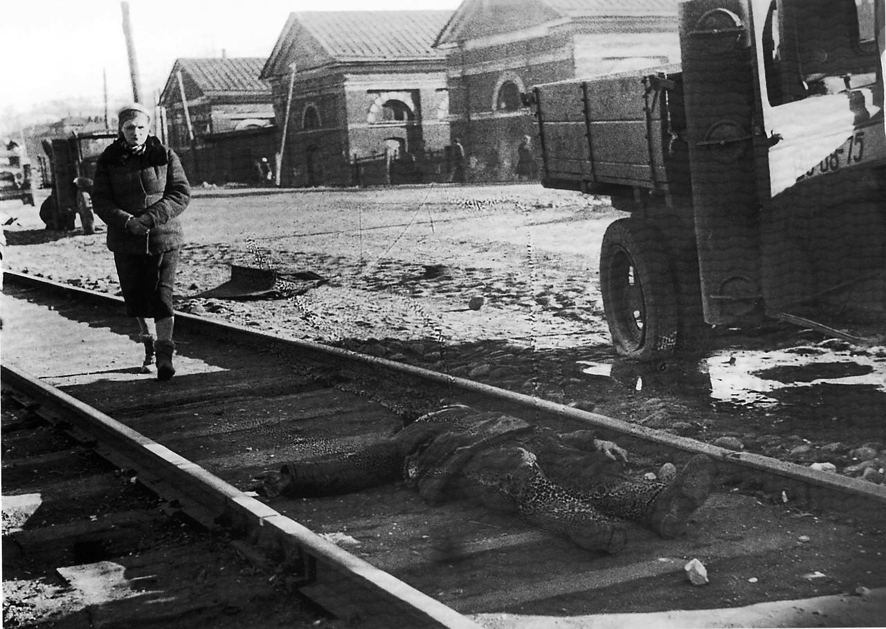 1943, апрель. Убитый осколком снаряда ленинградец в районе Мукомольного завода