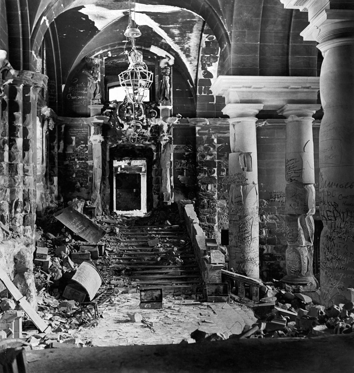 Интерьер здания Рейхстага после поражения Германии в войне. На стенах и колоннах — оставленные на память надписи советских солдат.